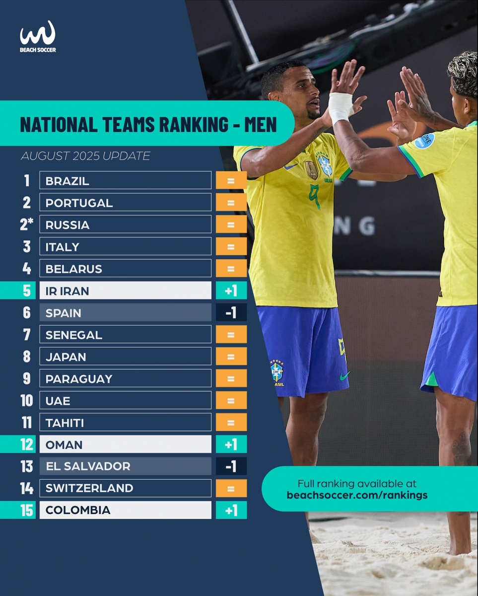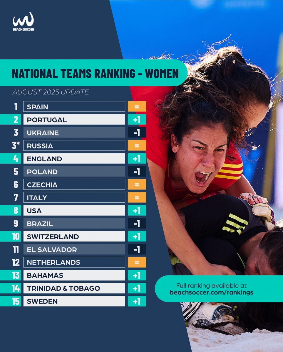 В перший день вересня 2025 міжнародна федерація пляжного футболу (BSWW) оприлюднила нові рейтинги національних збірних команд з бічсоккера.