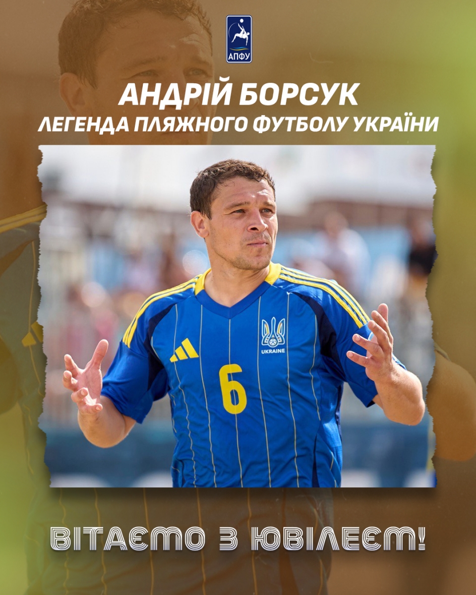 Пляжно-футбольна родина від щирого серця вітає 16 грудня 2025 року легендарного гравця, універсала збірної України з бічсоккера Андрія Борсука з Ювілеєм!